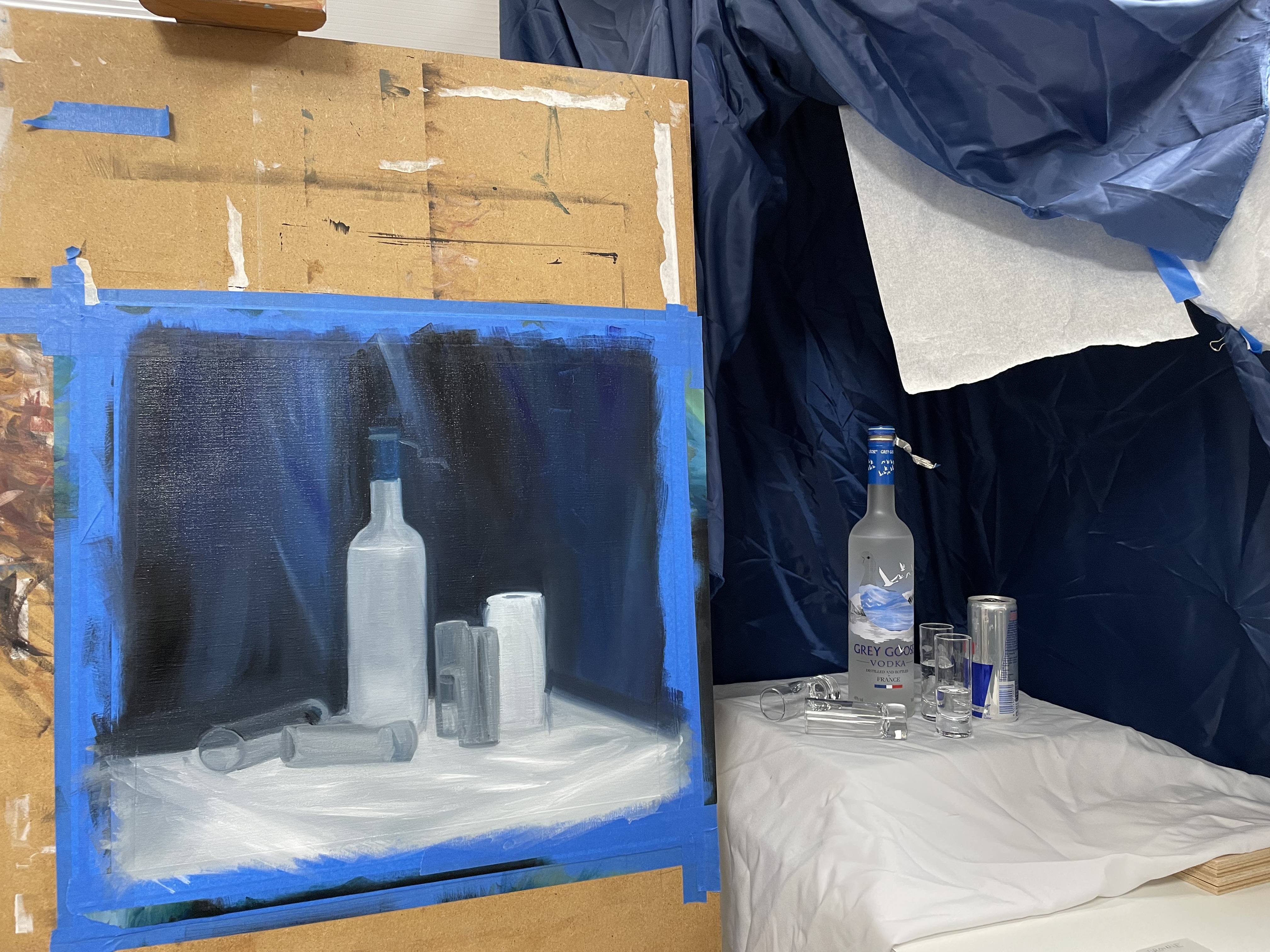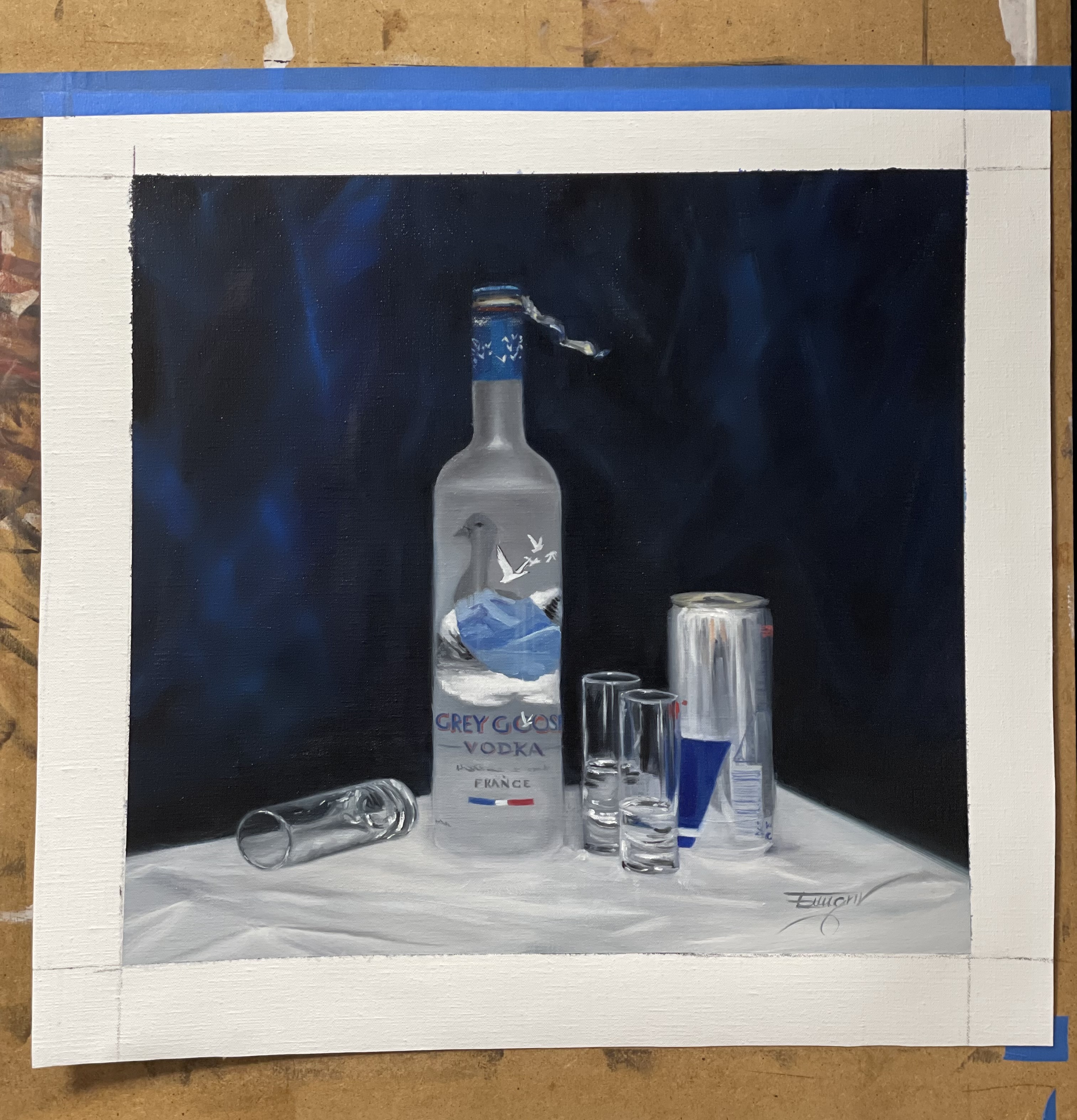 Grey Goose – Cocktail Time is an oil painting presenting a contemporary still life focused on a vodka bottle and glassware arranged on a white surface. The composition emphasizes transparency, reflections, and cool tonal contrasts, set against a deep, atmospheric background.