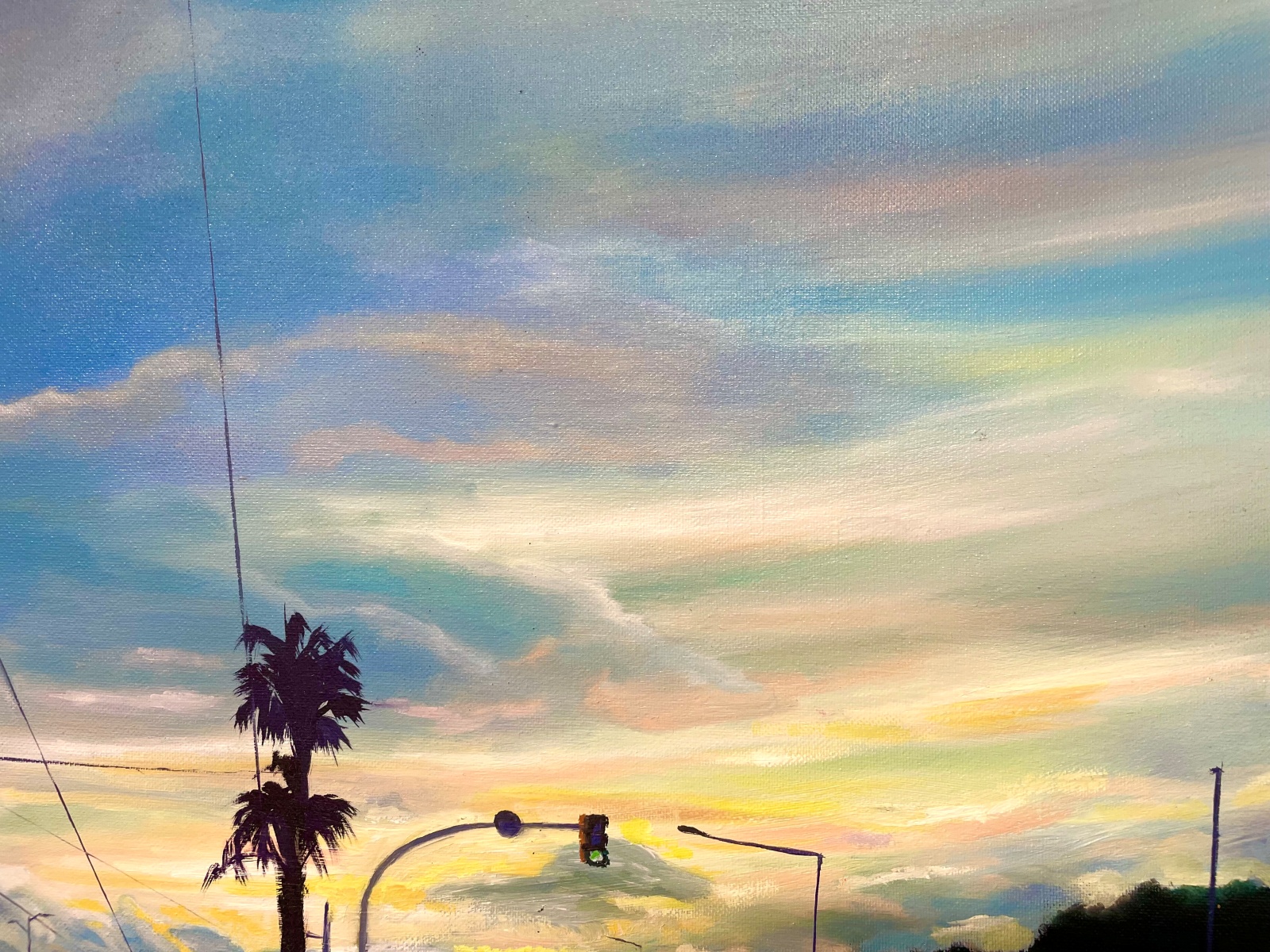 The painting explores the contrast between the constant movement of the city and the atmospheric calm above it. Subtle transitions of blue, yellow, and grey shape the clouds, while the structured geometry of the avenue anchors the composition in everyday urban life.