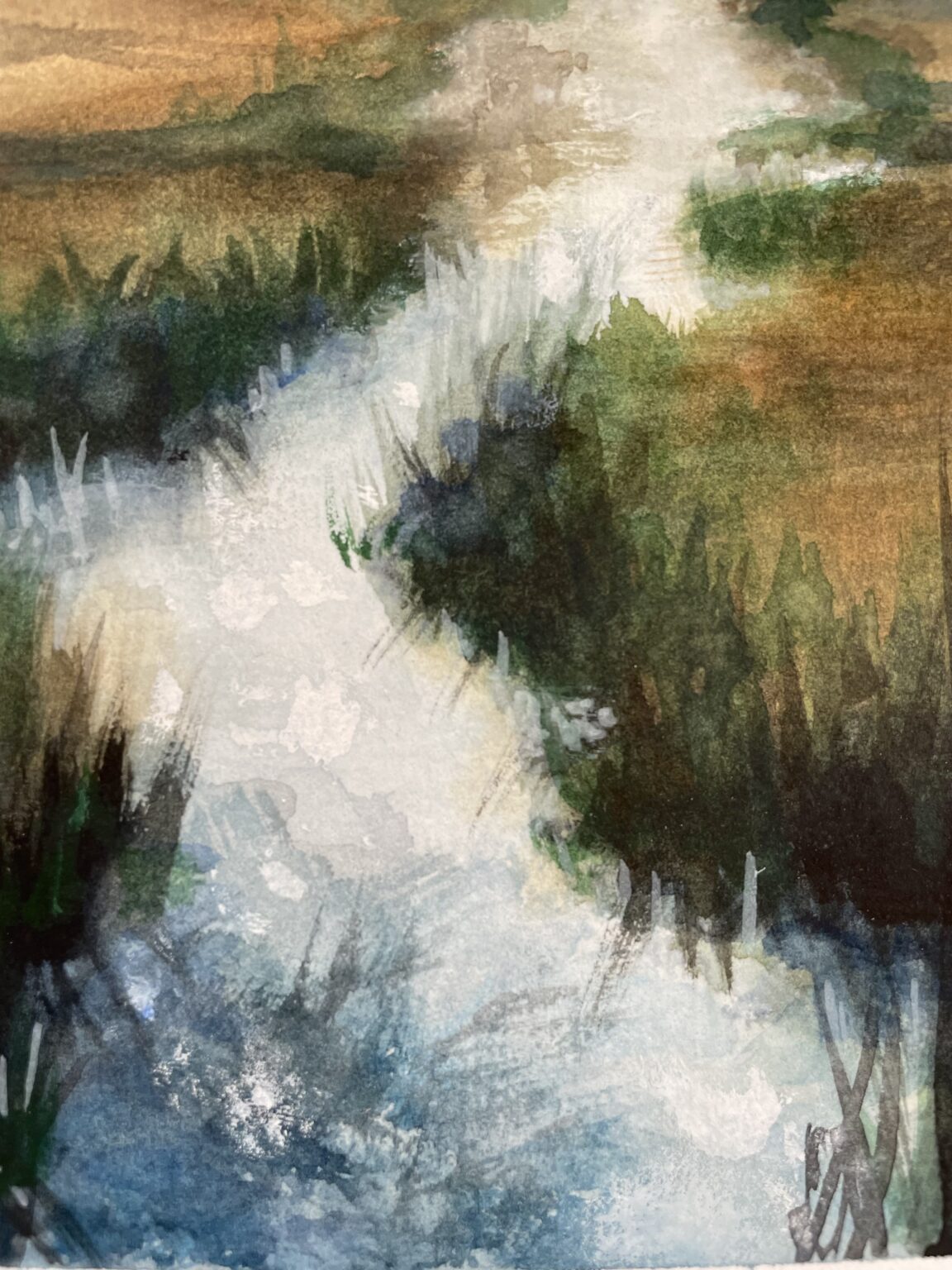 In this work, Virginie Martin-Blaise explores watercolour as a medium for atmosphere and perception. The painting reflects an ongoing interest in landscapes shaped by water, where silence, space, and observation invite a contemplative experience.