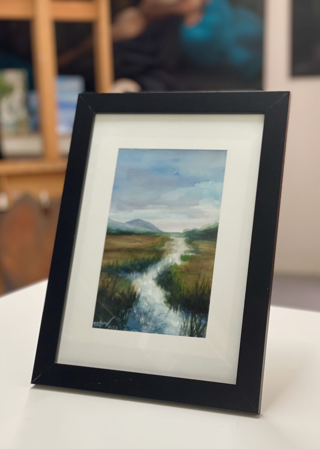 Through layered washes and subtle variations of green, blue, and earth tones, the painting captures the fragile balance of wetland environments. Light reflections on the water surface and the rhythmic presence of reeds create a sense of calm movement and natural continuity.