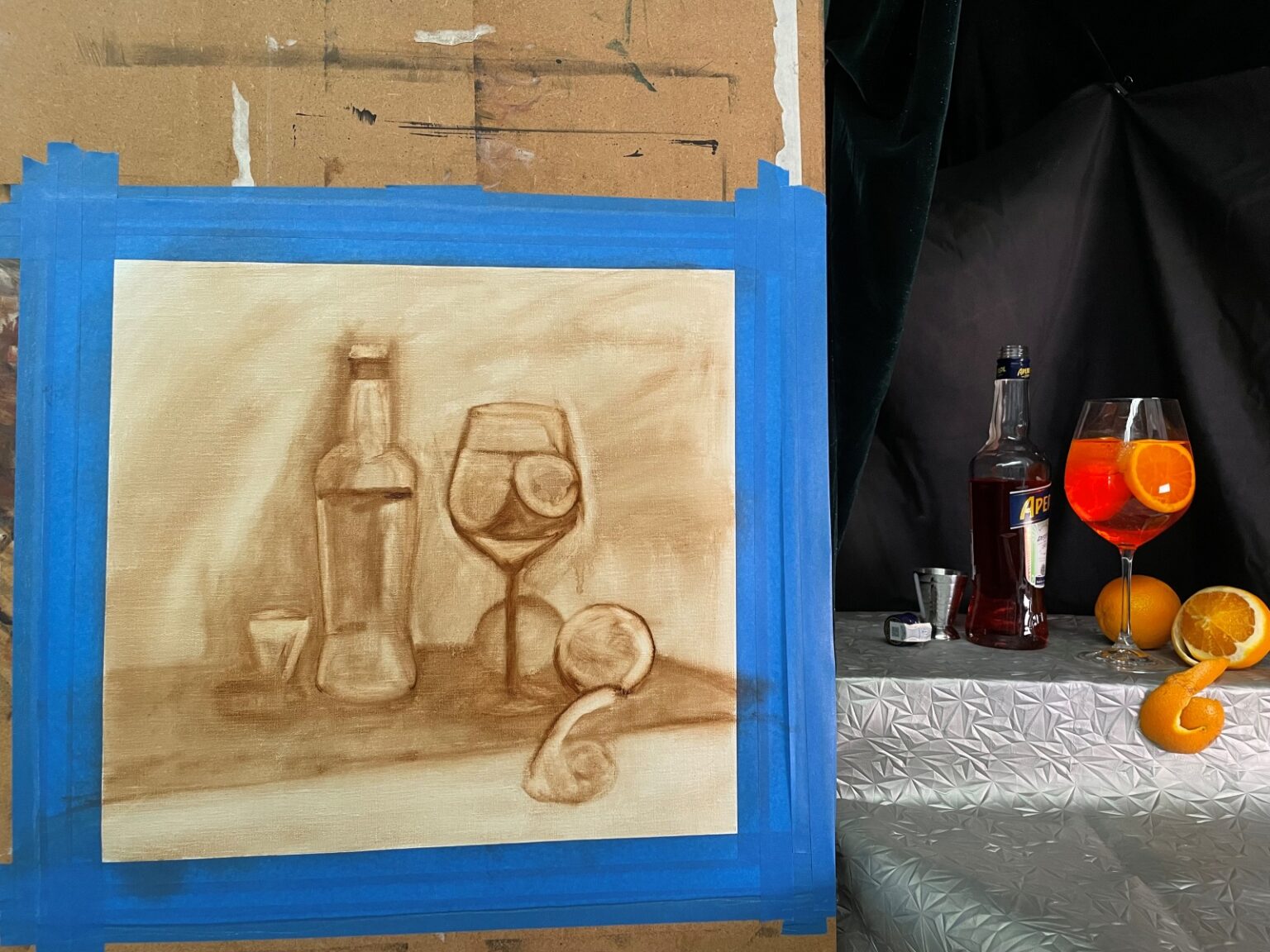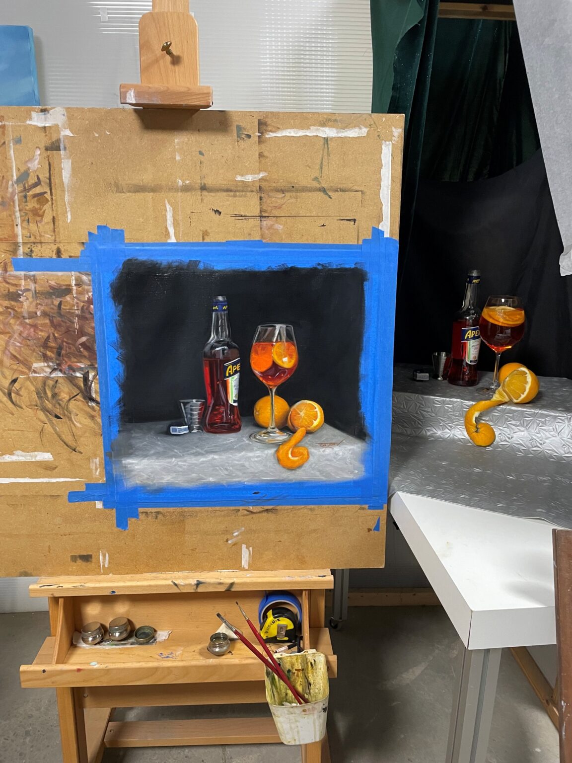 Spritz – Cocktail Time is an oil painting presenting a contemporary still life centered on a spritz cocktail. The composition brings together a glass filled with vibrant orange tones, citrus fruit, and an Aperol bottle, set against a dark background that enhances contrast and luminosity.