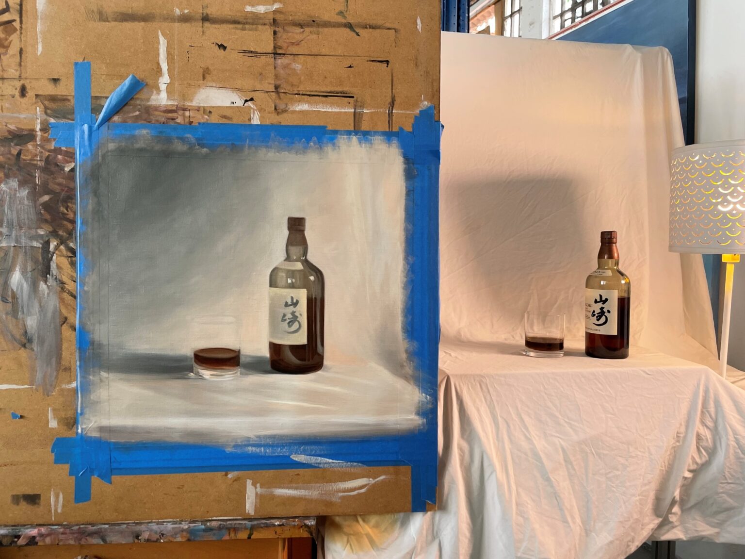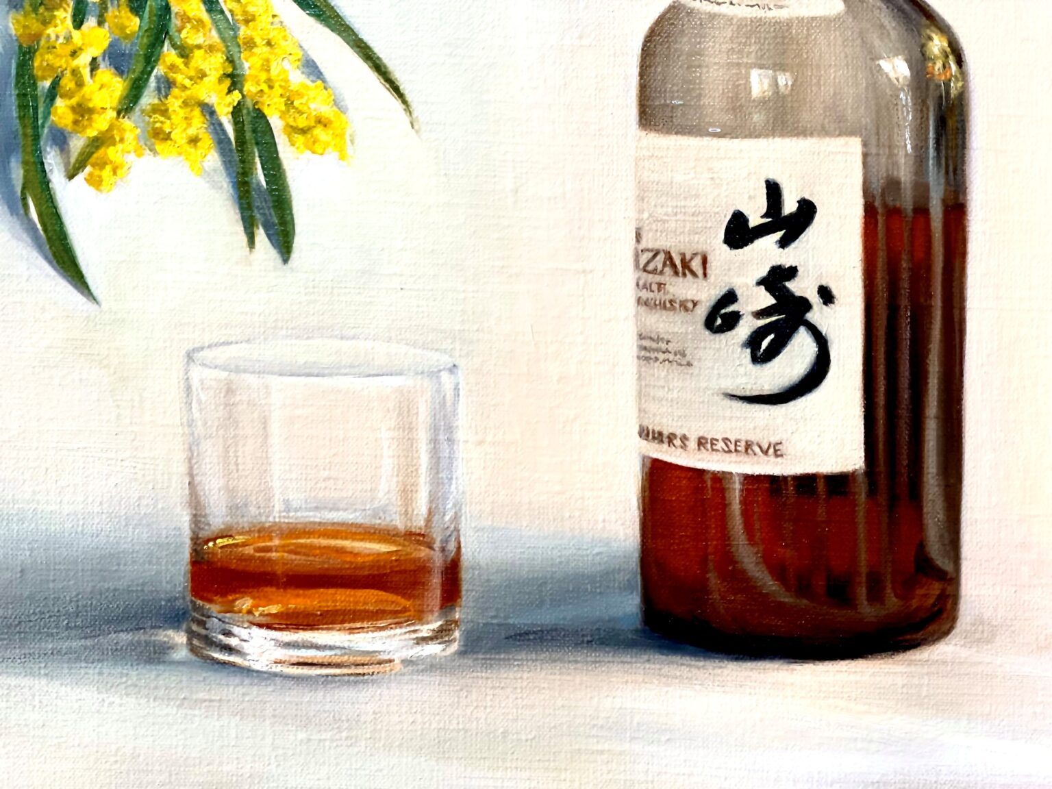Yamazaki – Cocktail Time is an oil painting presenting a contemporary still life centered on a bottle of Japanese whisky and a glass set against a neutral background. The composition emphasizes balance and restraint, allowing subtle variations of light, reflection, and texture to emerge with clarity.
